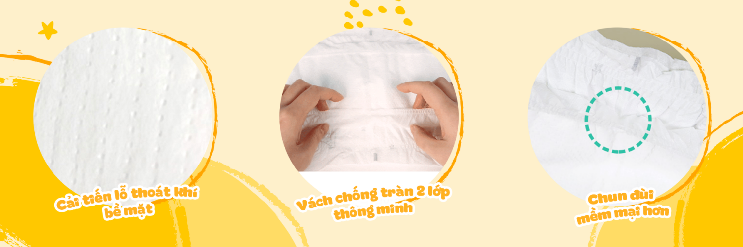 Phiên bản nâng cấp 2021 còn mang tới những tính năng ưu việt hơn so với phiên bản trước đây. Cấu trúc vách chống tràn được thay đổi để chống rò rỉ hiệu quả hơn, nay còn thêm tính năng chống tràn 2 lớp tối ưu hơn. Cùng với vách chống tràn, phần đai chun tiếp giáp với đùi trong của bé cải tiến thay đổi về chất liệu, mỏng hơn, mềm mại hơn, ôm sát vào cơ thể nhưng không hề khiến bé khó chịu khi vận động. Thiết kế lỗ thoát khí mặt ngoài bỉm cũng được cải tiến rõ rệt với cấu trúc dạng kim cương, tối ưu hóa luồng khí lưu chuyển, giúp chiếc bỉm nhanh khô hơn, thông thoáng hơn. Nhờ điều đó, chiếc bỉm luôn khô ráo ngay cả khi đã đầy.