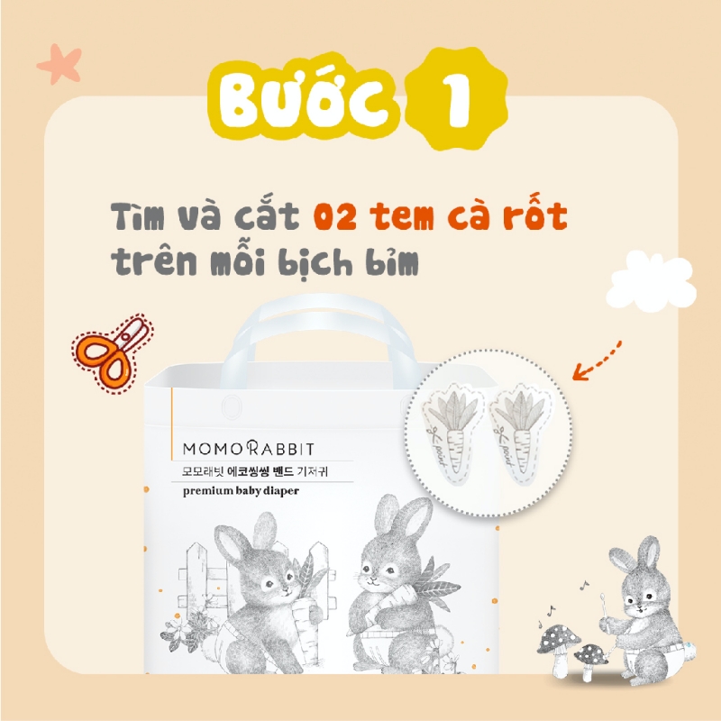 Bước 1: Tìm và cắt 2 tem carrot trên mỗi bịch bỉm Momo Rabbit