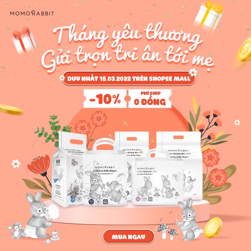 Siêu sale ưu đãi tháng 3 đã chính thức quay trở lại rồi! Mẹ đừng quên "lấp đầy" tủ bỉm xinh của bé yêu ngay với mức ưu đãi lên tới 10% tại gian hàng chính hãng của Momo Rabbit trên Shopee nha!