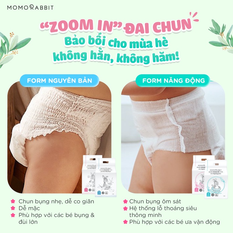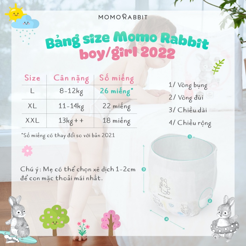 Trong phiên bản giới hạn mang tính thử nghiệm này của Momo Rabbit, các thông số trong kích thước bỉm có đôi chút điều chỉnh dựa trên thống kê về hình thể của bé. Mục tiêu lớn nhất của những điều chỉnh này nhằm tạo ra một sản phẩm bỉm quần vừa vặn hơn, thoải mái hơn, hướng tới các em bé “active”, vận động dễ dàng suốt 24h đóng bỉm.